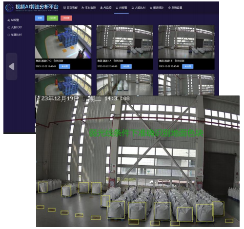通过安装在仓库内的摄像头识别库区库位的状态,结合定制AI算法,识别为空或者满或其他状态,传递给AGV小车控制平台,对货物进行自动堆放。